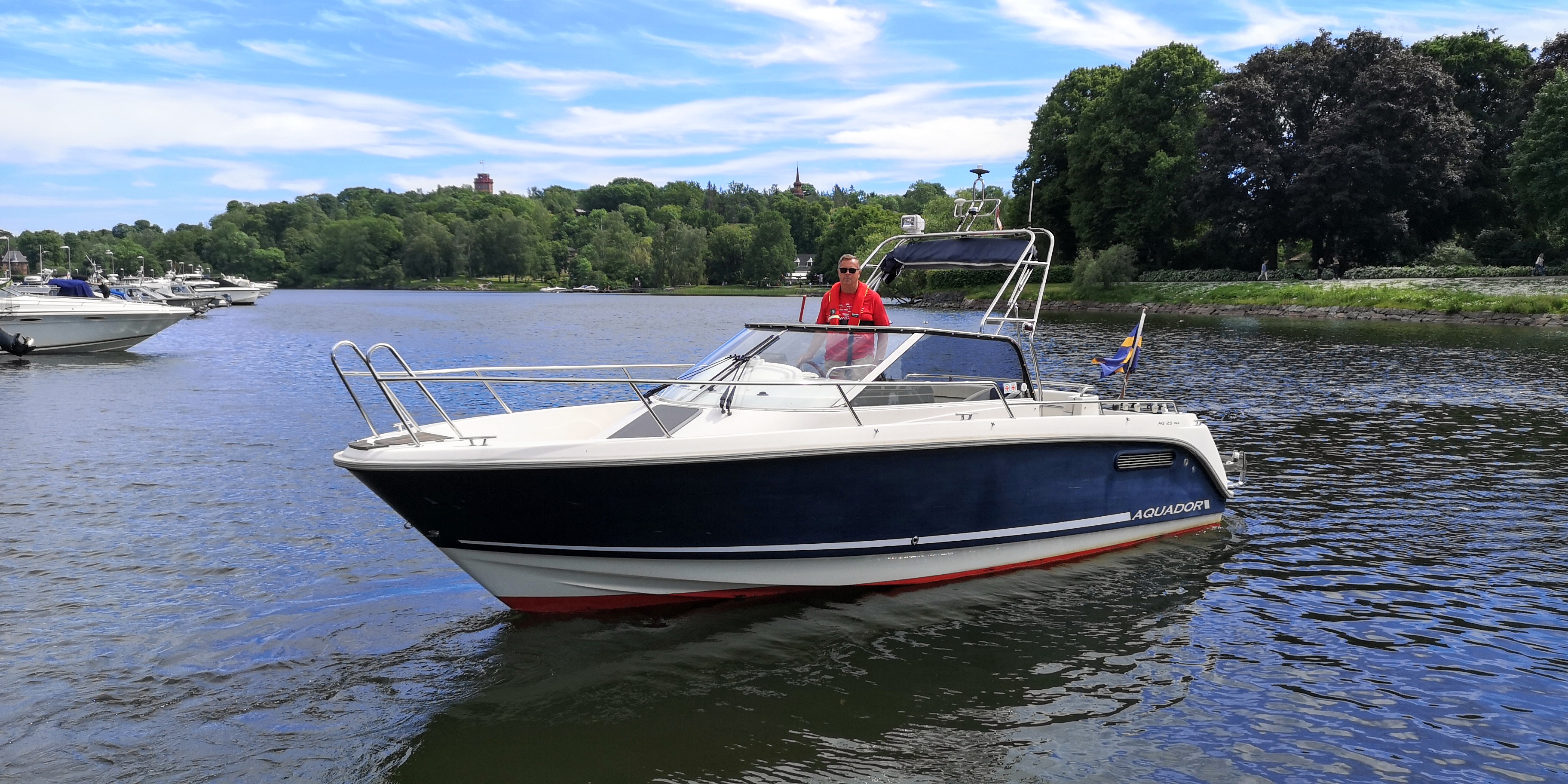 Vi köpte också en båt i juli 2017, en Aquador 25 WA från 2003 med en VolvoPenta 5,0 Gi (V8 på 275 hk). Här en bild när Kennet lämnade av Ingrid vid Djurgårdsbron i Stockholm. Båten såldes i slutet av maj 2023 och finns numera i Mälaren.